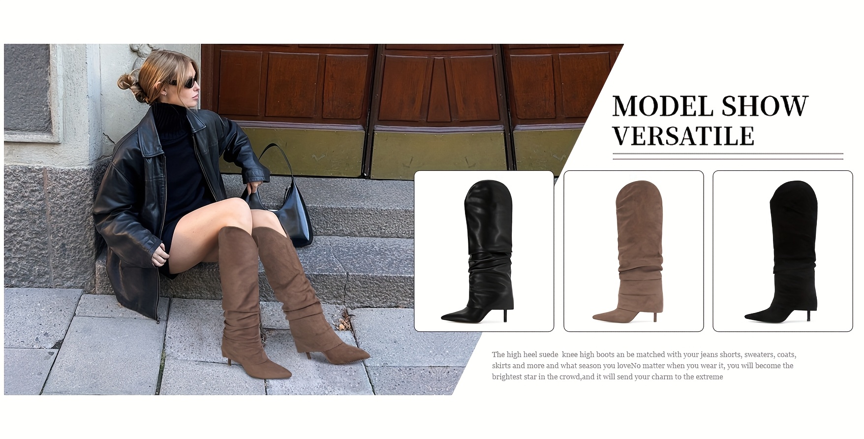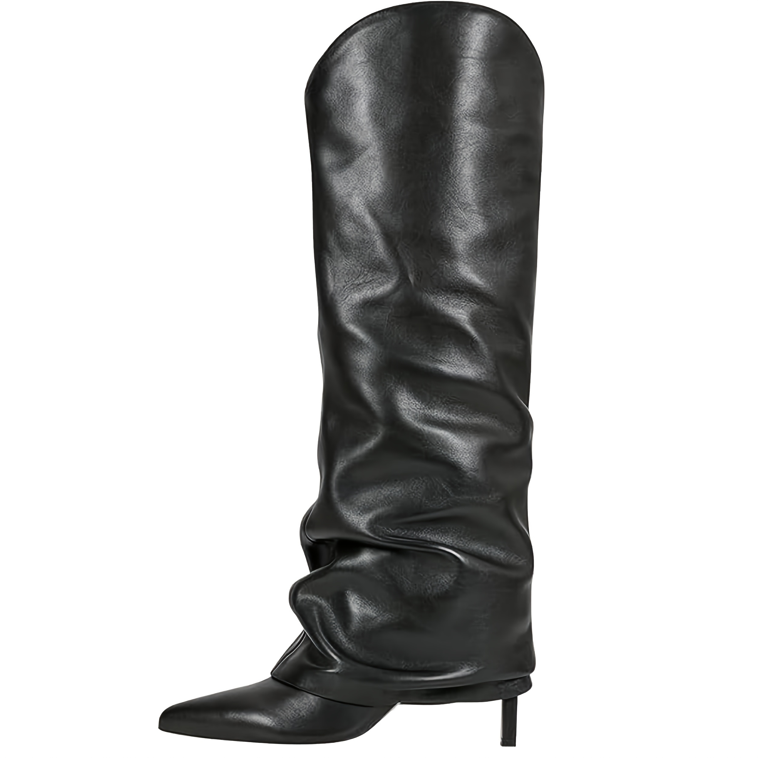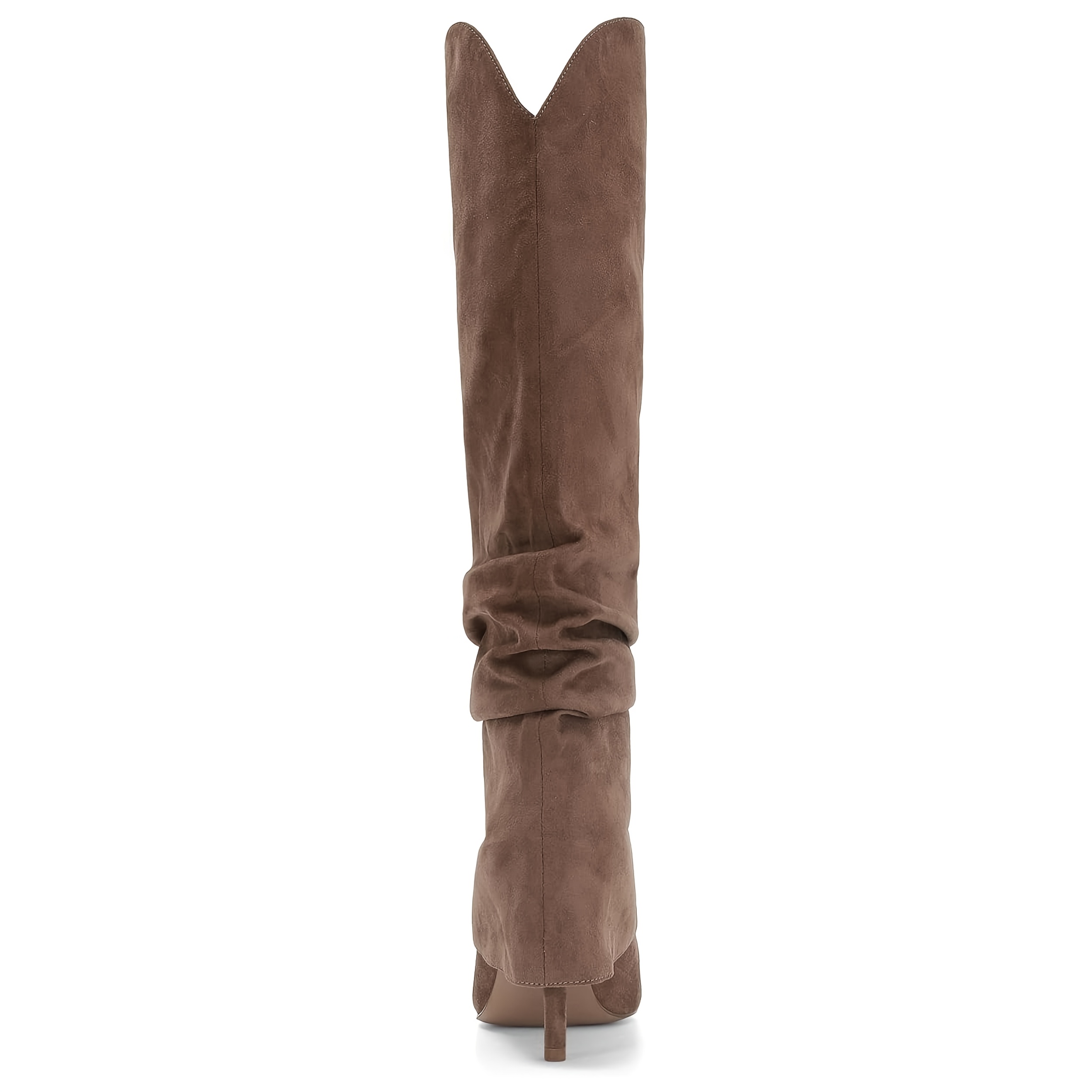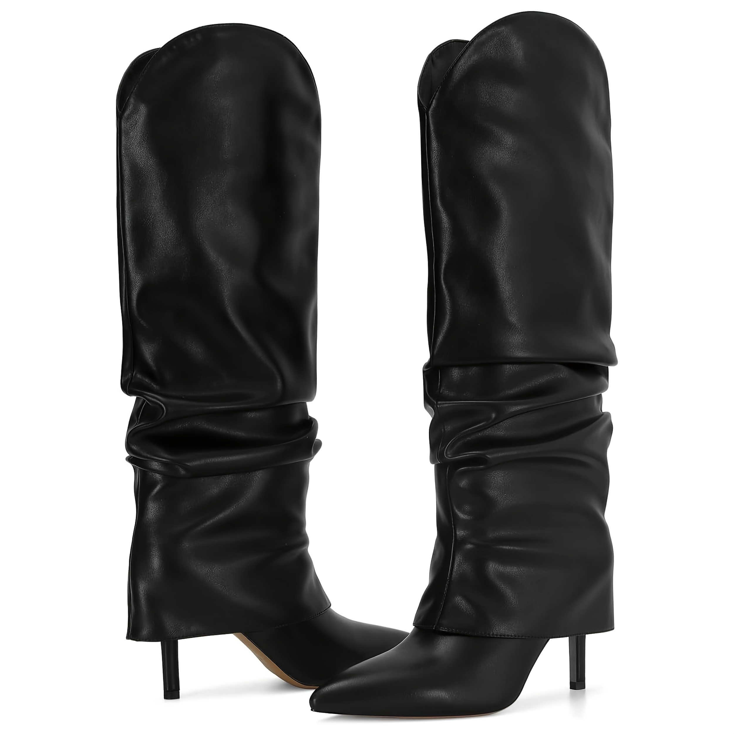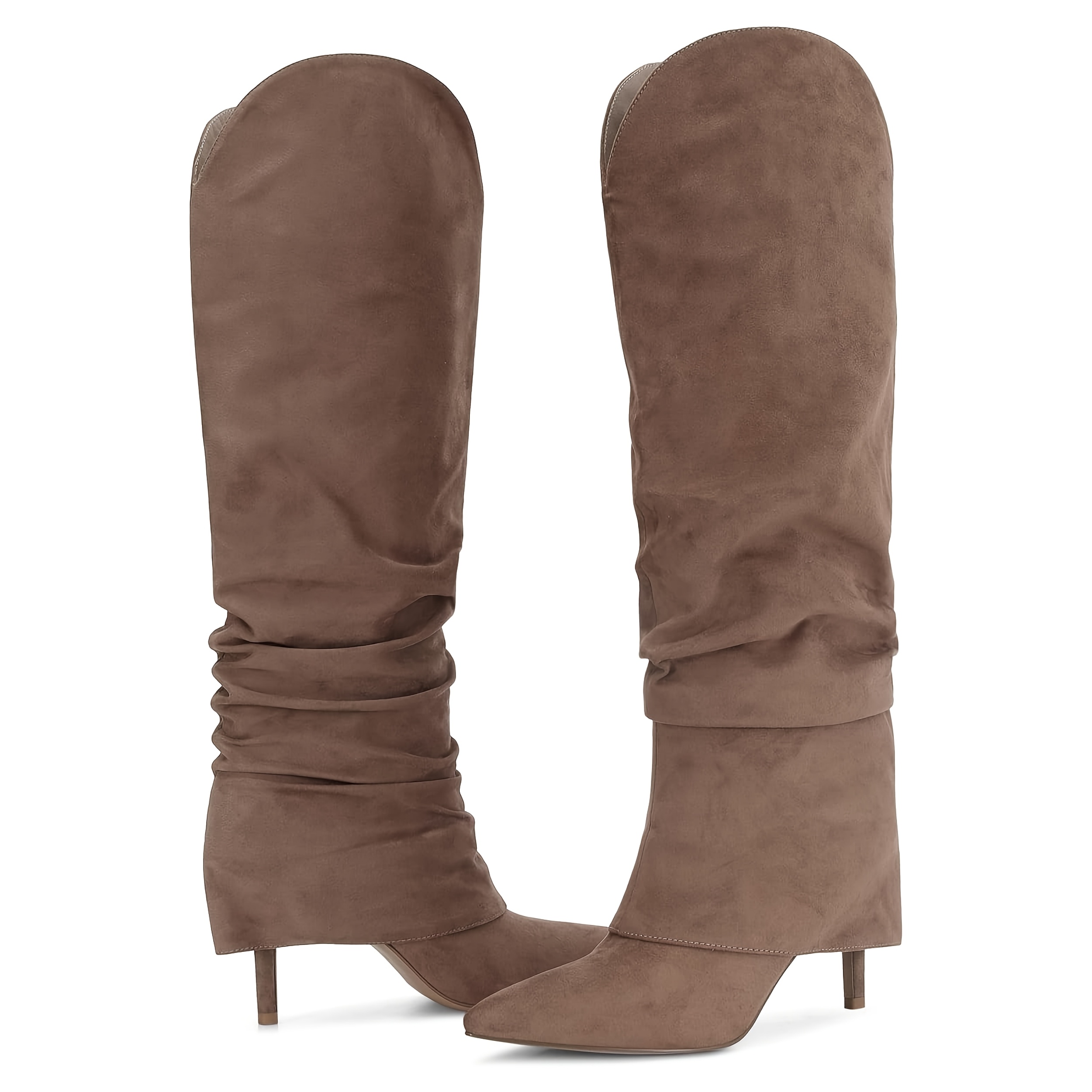 Women'S Genuine Leather Fold Over Knee High Boots - Wide Calf Pointed Toe Stiletto Heels, Pull-On Closure, All-Season Tall Booties with Cushioned Insole & Arch Support, Brown/Coffee - Versatile for Ca